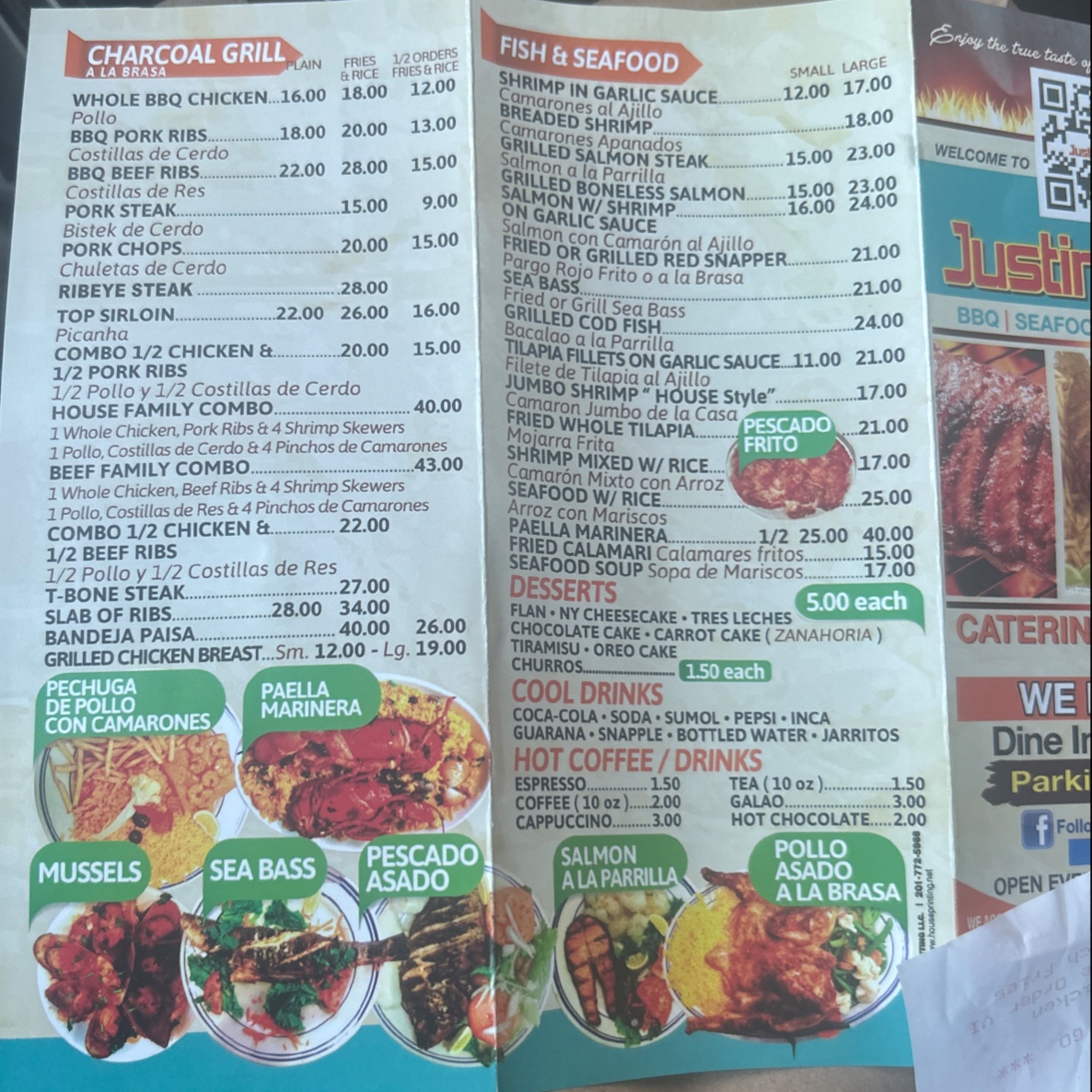 One whole chicken, pork ribs and four shrimp skewers one pollo, costillas de cerdo and four pinchos de camarones.